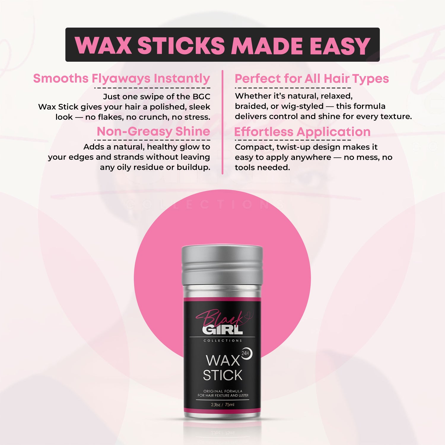 Our Wax Stick is designed to lay flyaways, control frizz, and add a clean, healthy shine without flakes, grease, or buildup. One swipe delivers a polished finish that lasts — whether you’re styling edges, wigs, braids, or natural hair.